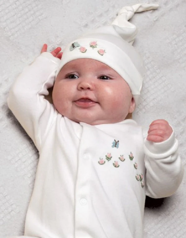Soft cotton baby footies designed for comfort and easy changes. Snap buttons make dressing simple, while delicate embroidery on the front and a matching design on the baby’s bottom add a sweet, cuddly detail. Complete the look with the matching hat and bib.