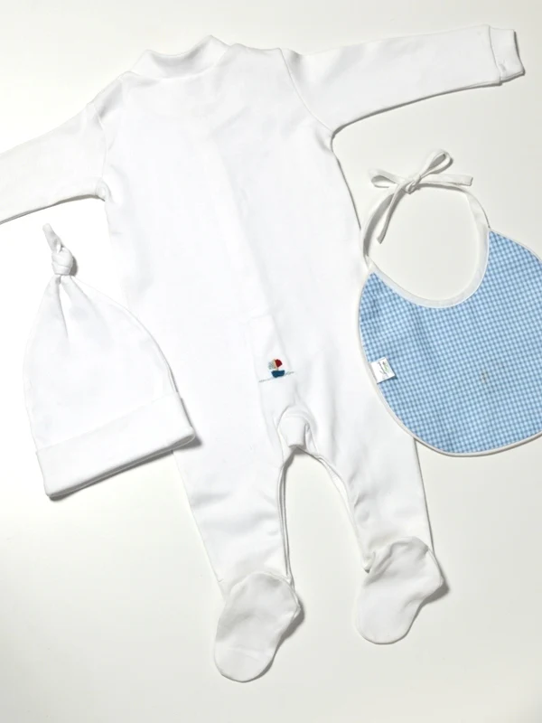 Soft cotton baby footies designed for comfort and easy changes. Snap buttons make dressing simple, while delicate embroidery on the front and a matching design on the baby’s bottom add a sweet, cuddly detail. Complete the look with the matching hat and bib.