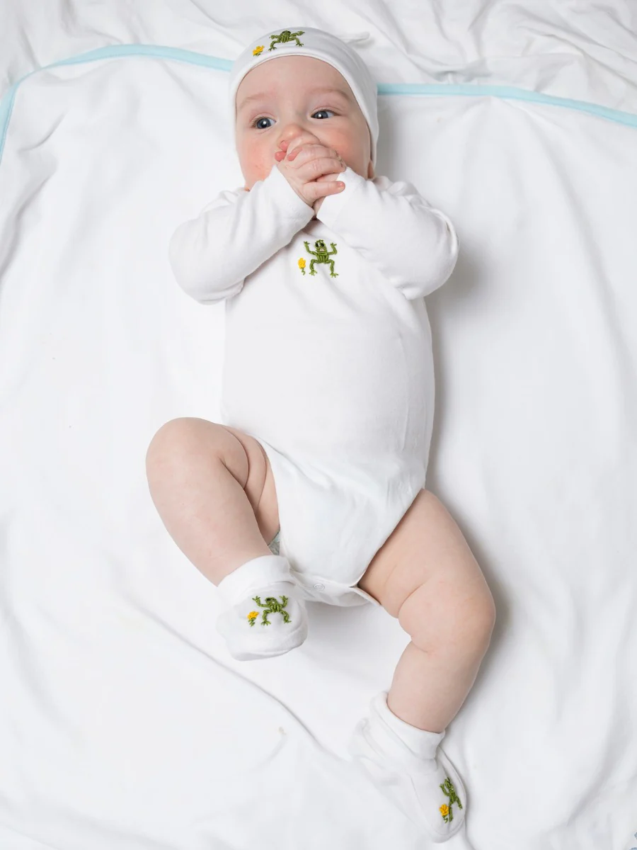 Your baby's snug little Onesie is made of 100% cotton and super soft to the touch. It features snaps to ensure easy, hassle-free outfit and diaper changes. The Onesies have a single design embroidered on the chest and also on baby’s bottom, inviting an irresistible cuddle from all! Don't forget to order the matching Hat & Booties to complete his or her outfit.