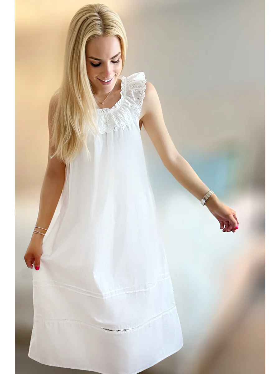 The Mia Nightgown features eyelet lace, a ruffled neckline, and pintuck details. Falling just below the knee, its flowy 100% cotton lawn fabric makes it perfect for lounging and sleeping in elegance.