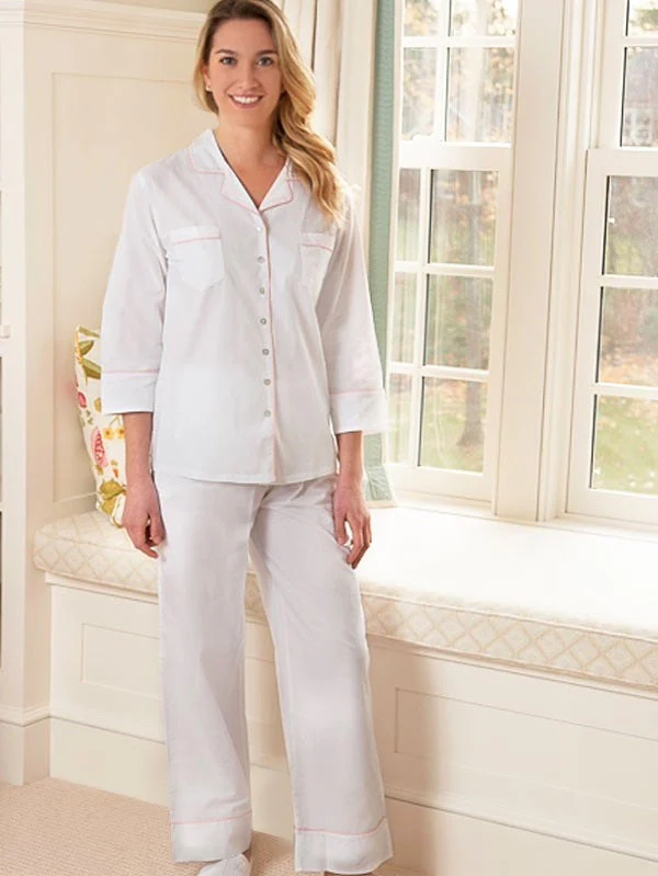 Mary White Cotton Pajamas, Pink Piping